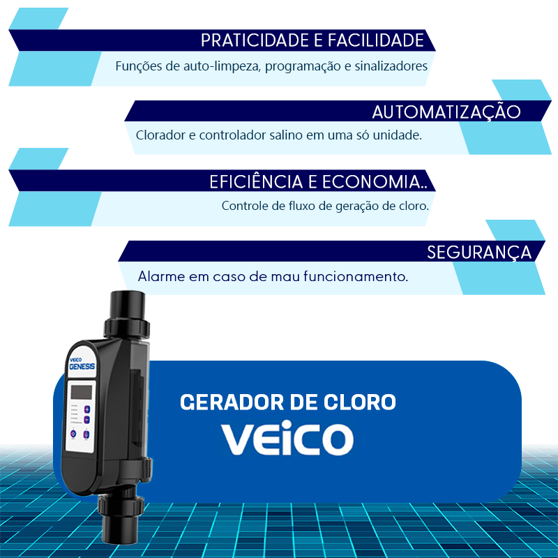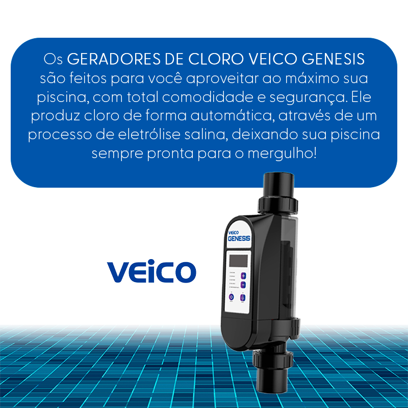 Os Geradores de Cloro Veico Genesis são feitos para você aproveitar ao máximo sua piscina, com total comodidade e segurança. Ele produz cloro de forma automática, através de um processo de eletrólise salina, deixando sua piscina sempre pronta para o mergulho!