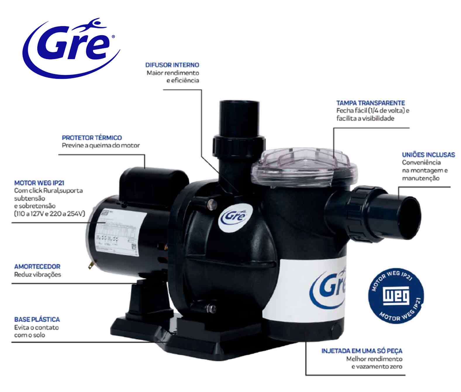Motobomba 1/2 CV IP 21, da GRE, é confeccionada com parafusos em aço inox e o interior com plásticos de engenharia com rotor em Noryl, o que faz com que sua estrutura tenha mais durabilidade e resistência para operar no bombeamento de água.